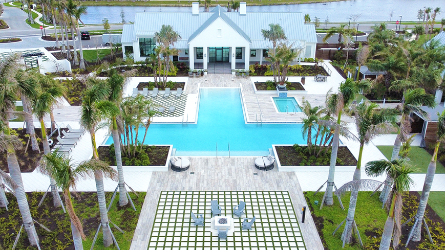 Palmera combines tropical flair with diverse home styles and lush landscaping, evoking a vacation-like atmosphere for residents.